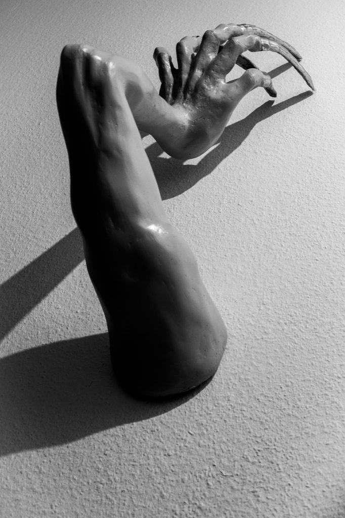 This sculpture captures the raw, visceral energy of a being in motion, grappling with unseen forces. The muscular, earth-toned limb extends forward, its fingers elongated into sharp, metallic claws, each glistening with an almost predatory sheen. The combination of organic form and mechanical elements suggests a creature that has adapted or transformed, using every resource at its disposal to navigate a harsh world.