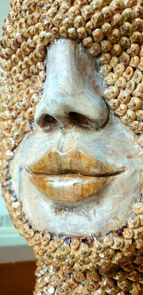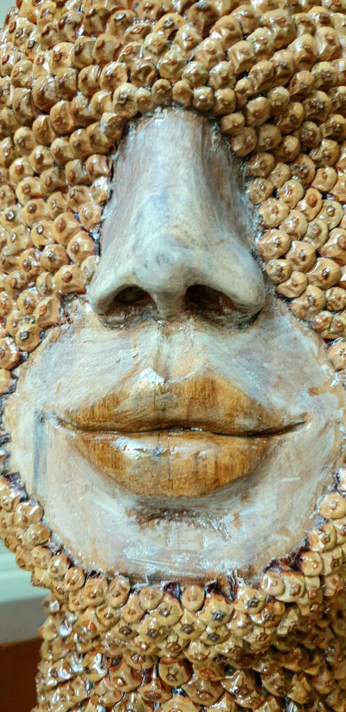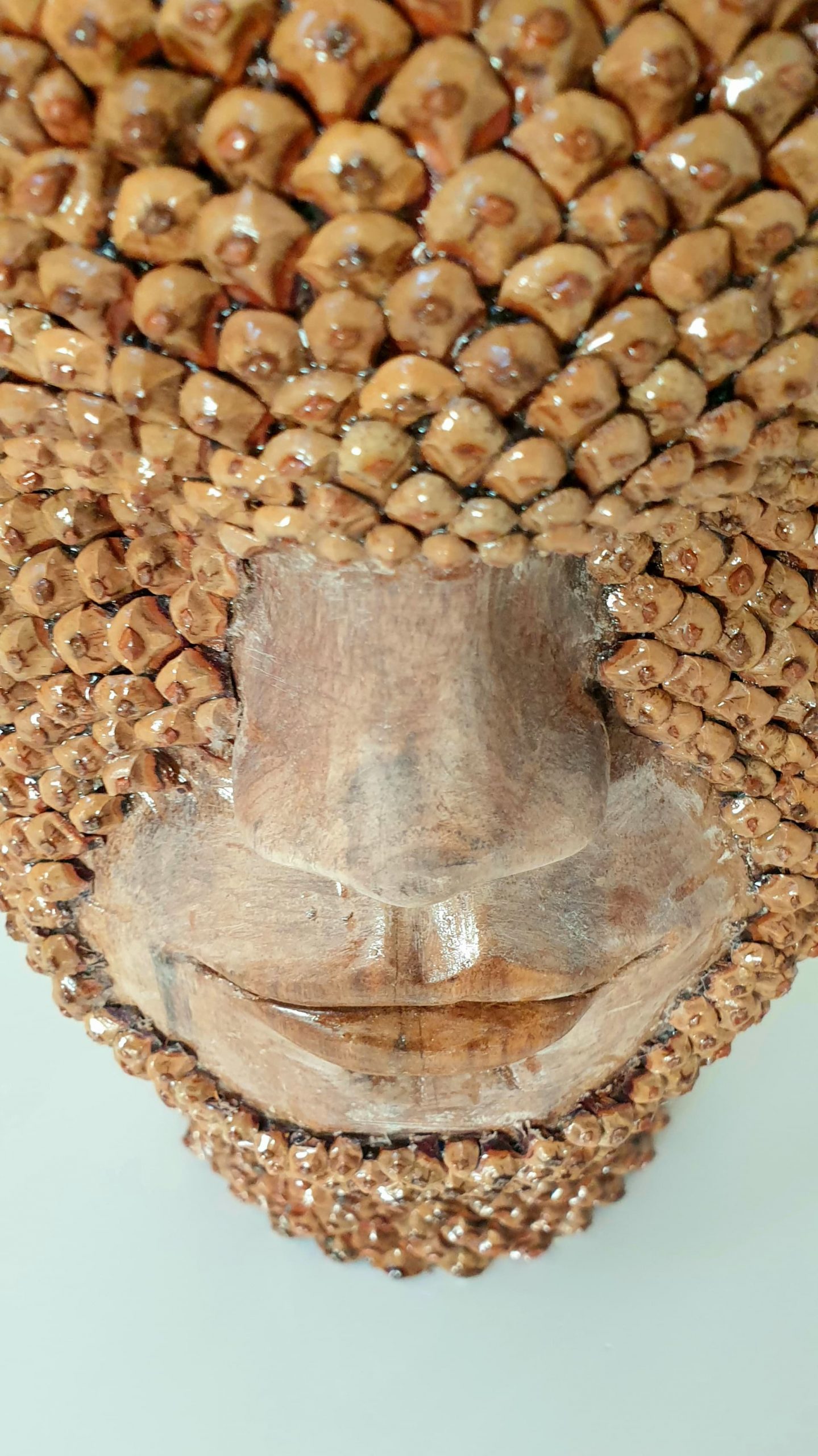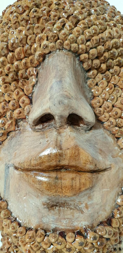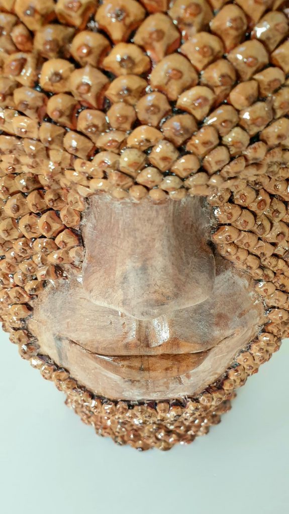 This sculpture, “Synthesis – The Secret of Thought – Associative Memory,” reflects the intricate tapestry of human cognition, where memories and thoughts intertwine to create a profound network of associations. The face, textured with countless small pine cone shells, embodies the complex and layered nature of memory—a mosaic of countless moments, each contributing to the formation of identity and consciousness.